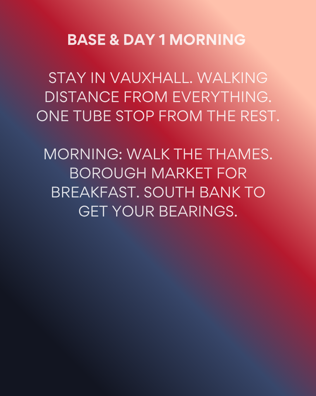 Start on foot. London makes more sense when you walk it first — the tube is fast but it hides the city from you. Head for the Thames and walk the South Bank from Vauxhall Bridge toward Borough Market. The walk takes around 30 minutes at a relaxed pace and passes the Tate Modern, the Millennium Bridge, and a stretch of river that gives you a genuinely good first read of the city.