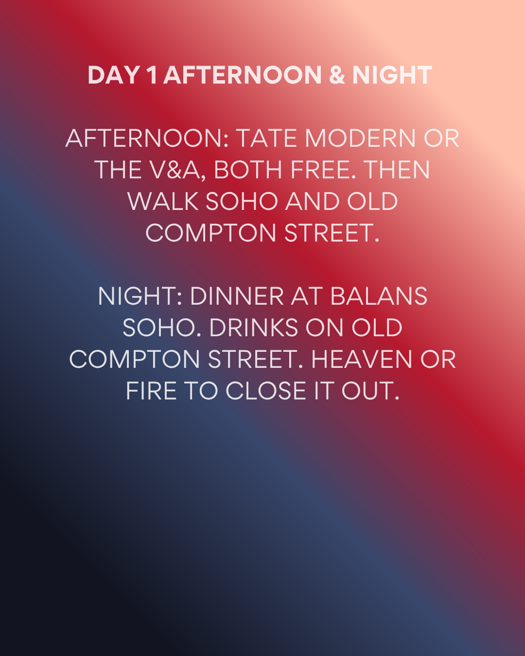 Day two starts slower. Brunch first — Balans Soho again if you loved it, or head to Dalston or Hackney if you want to push east and get a feel for a different part of the city.