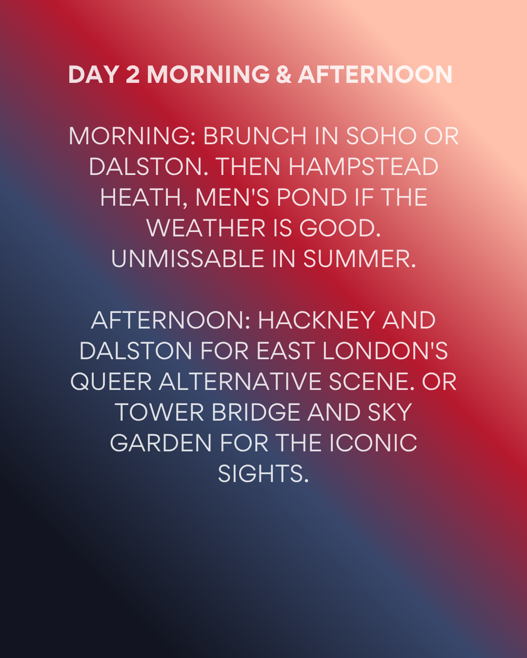 Spend the afternoon somewhere you haven't been yet. Hackney and Dalston are the obvious choice for gay travellers who want something beyond the Vauxhall circuit. Dalston Superstore on Kingsland Road is a queer bar and venue with an artistically driven crowd, excellent music, and a genuinely different atmosphere from anything in Vauxhall or Soho. The neighbourhood around it has good independent restaurants and coffee worth exploring on foot.