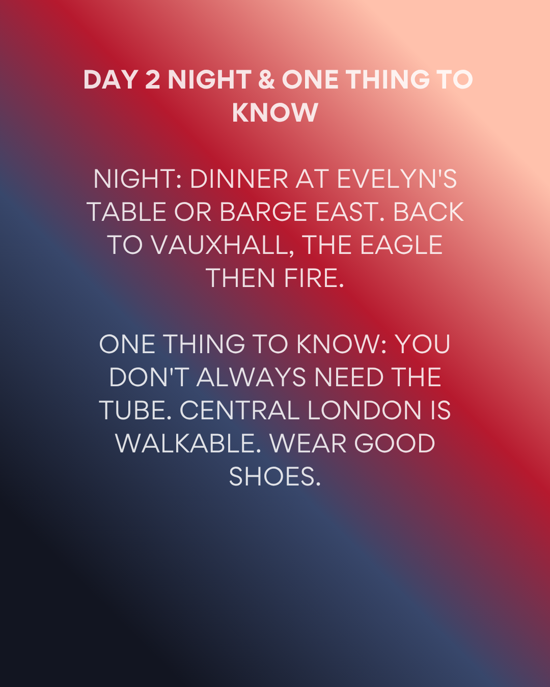 Night two is for dinner somewhere worth planning ahead for. Evelyn's Table in Soho is an intimate tasting menu restaurant with a deserved reputation — small, special, and the kind of meal you remember. Barge East in Hackney Wick is a restaurant on a moored boat that offers a genuinely unique experience and one of the more interesting settings in the city. One respondent also flagged the boat restaurant on the Thames in front of the Park Riverbank Hotel as a strong option.