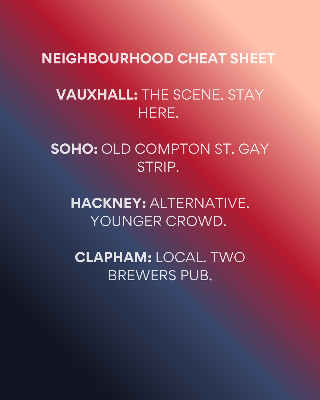 Talk to people in pubs. London has a reputation for being unfriendly to strangers that isn't entirely unearned. But in a gay pub or bar, the culture is genuinely warm. As one respondent put it: people are lovely in pubs — strike up a conversation and make a new friend. Take that advice seriously.