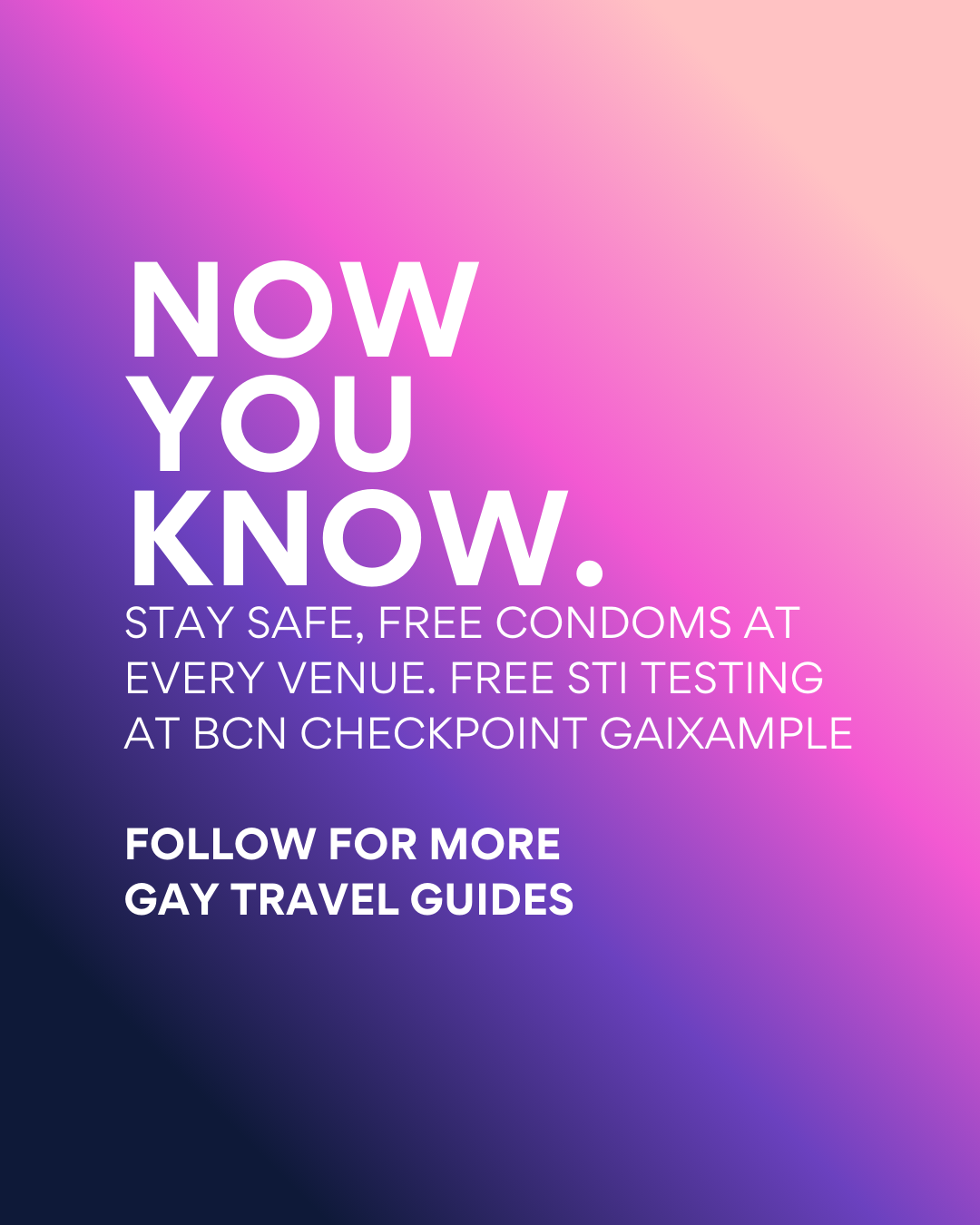 Free condoms are available at every venue on this list. Barcelona takes sexual health provision seriously and the infrastructure around it is good. Free STI testing is available at BCN Checkpoint in the Gayxample district — a well-run, non-judgmental service worth knowing about if you're spending any significant time in the city.