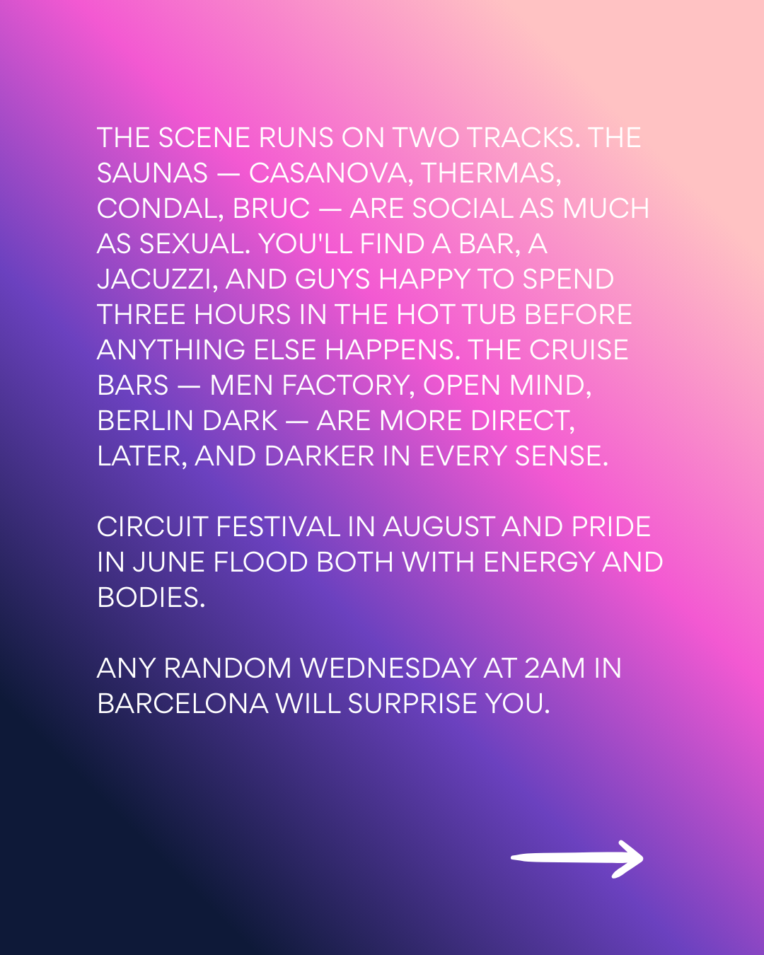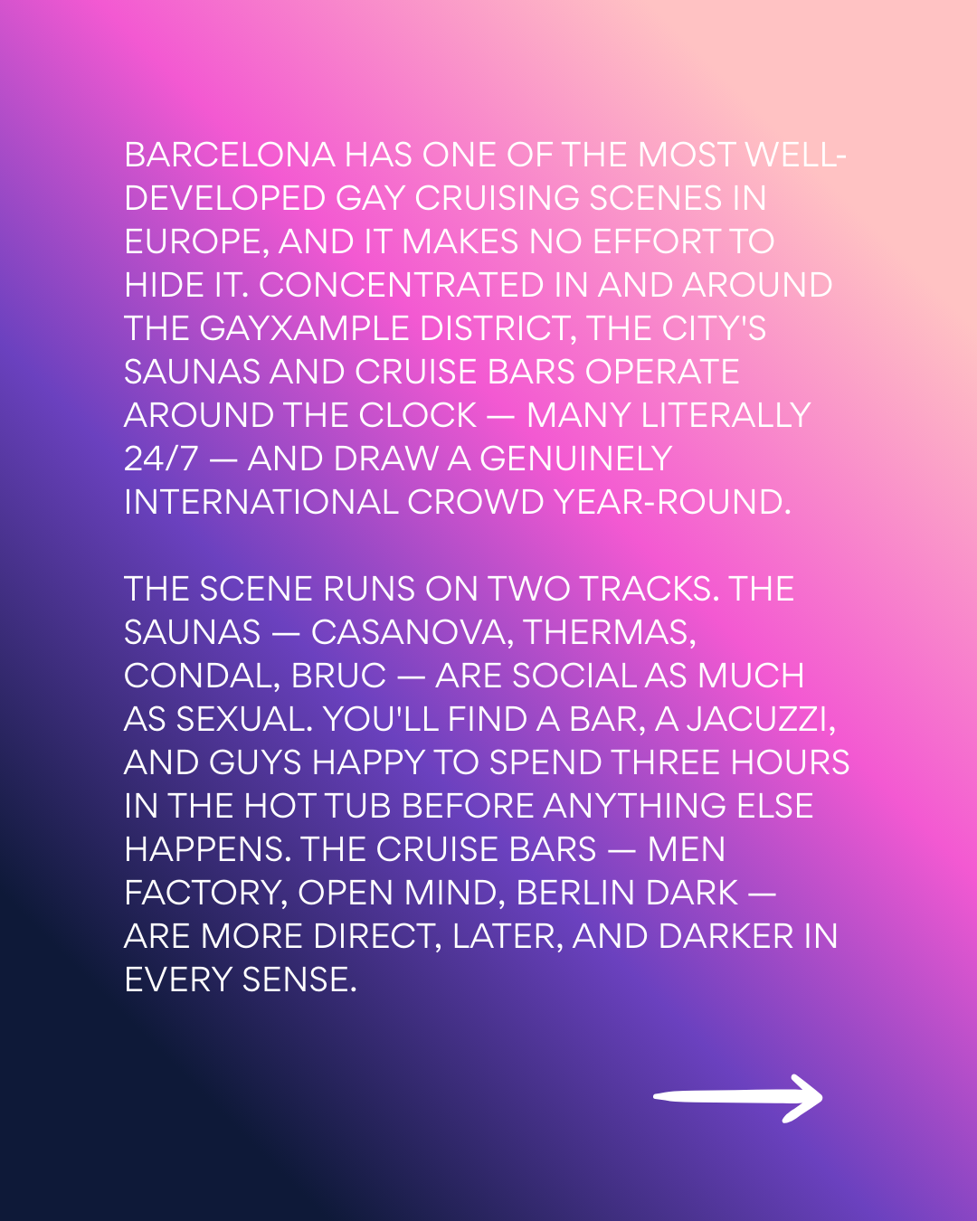 The scene runs on two tracks. The saunas — Casanova, Thermas, Condal, Bruc — are social as much as sexual. You'll find a bar, a jacuzzi, and guys happy to spend three hours in the hot tub before anything else happens. The cruise bars — Men Factory, Open Mind, Berlin Dark — are more direct, later, and darker in every sense.