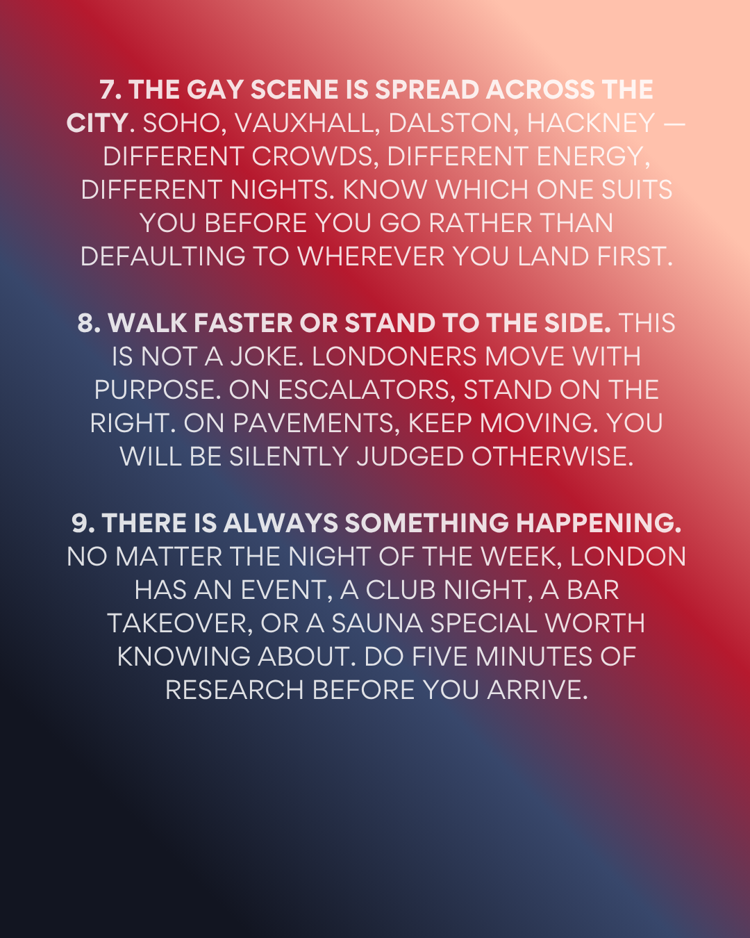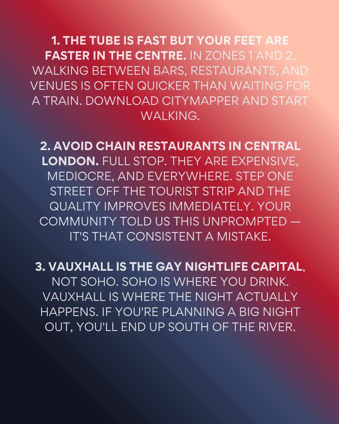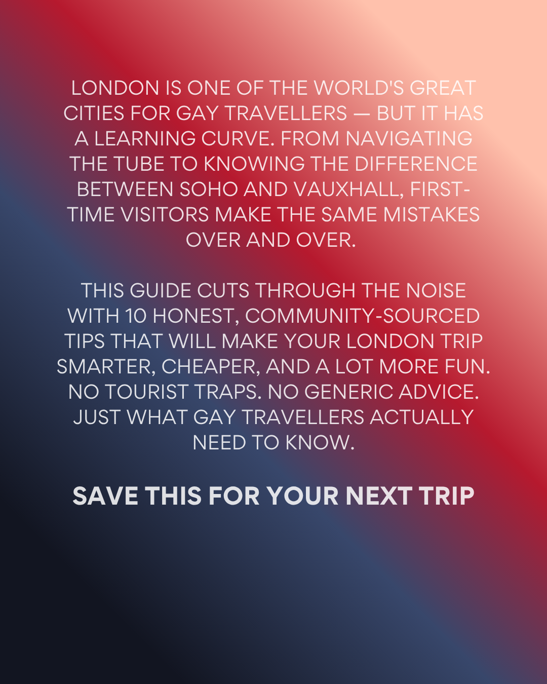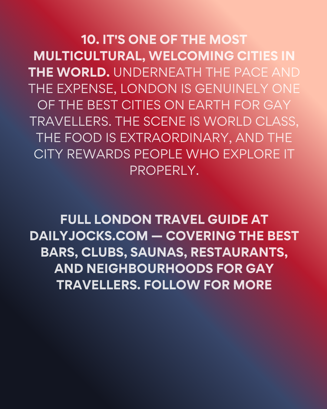 Underneath the pace and the expense, London is genuinely one of the best cities on earth for gay travellers. The scene is world class, the food is extraordinary, and the city rewards people who explore it properly.