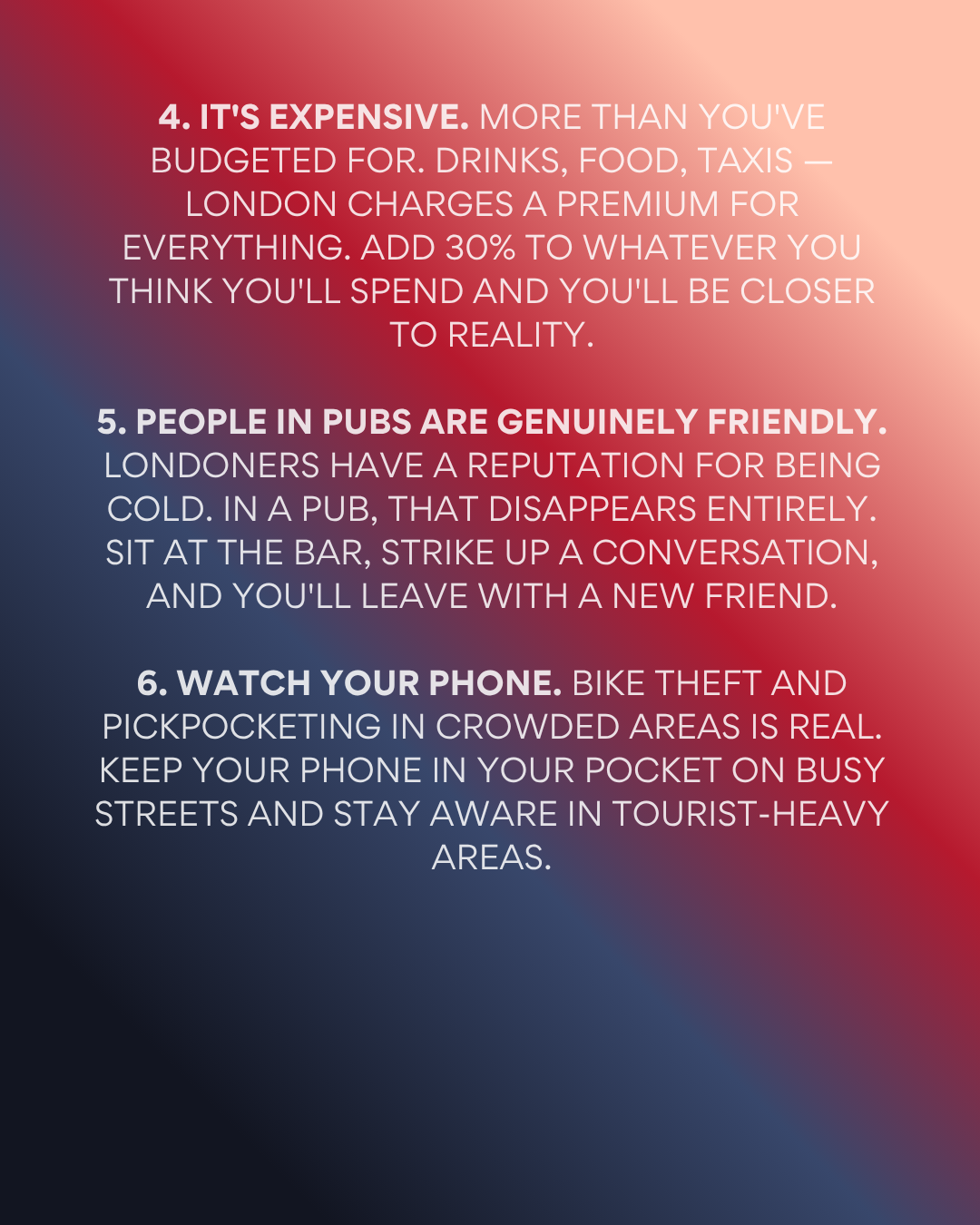Drinks, food, taxis — London charges a premium for everything. Add 30% to whatever you think you'll spend and you'll be closer to reality.