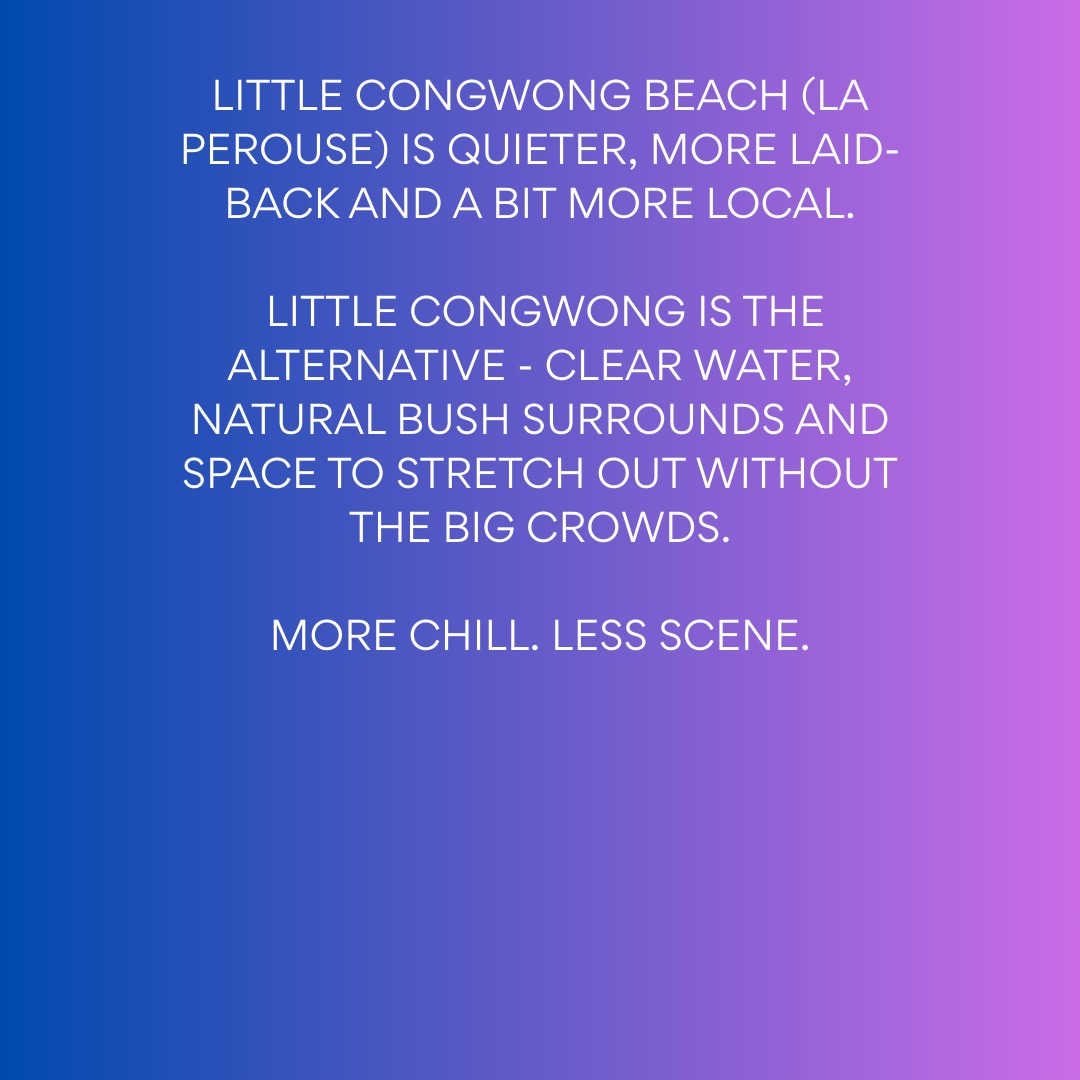 Little Congwong sits near La Perouse in Botany Bay, on the southern edge of the city, and operates on a noticeably different frequency from the harbour beaches. Quieter, more laid-back, and genuinely more local in its character, it's the alternative for people who want the clothing-optional experience without the social intensity that Lady Bay and Obelisk can carry on a busy summer weekend.