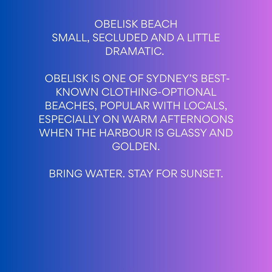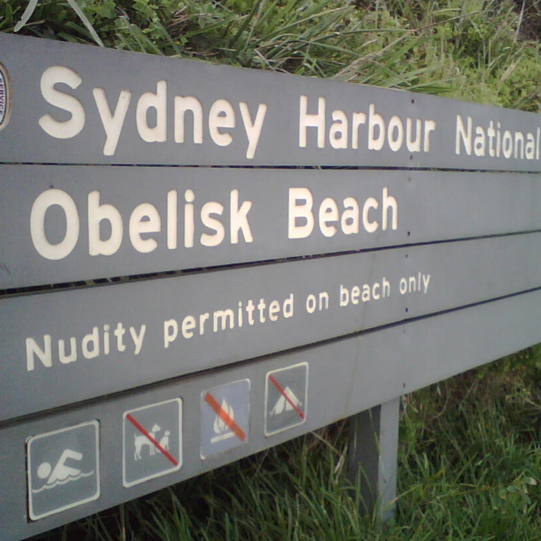 Obelisk sits within Sydney Harbour National Park on the Middle Head peninsula in Mosman, and it is one of Sydney's best-known and officially designated clothing-optional beaches. The National Parks sign at the entrance makes it clear — nudity is permitted on beach only — which gives it a formal status that the other beaches don't have.