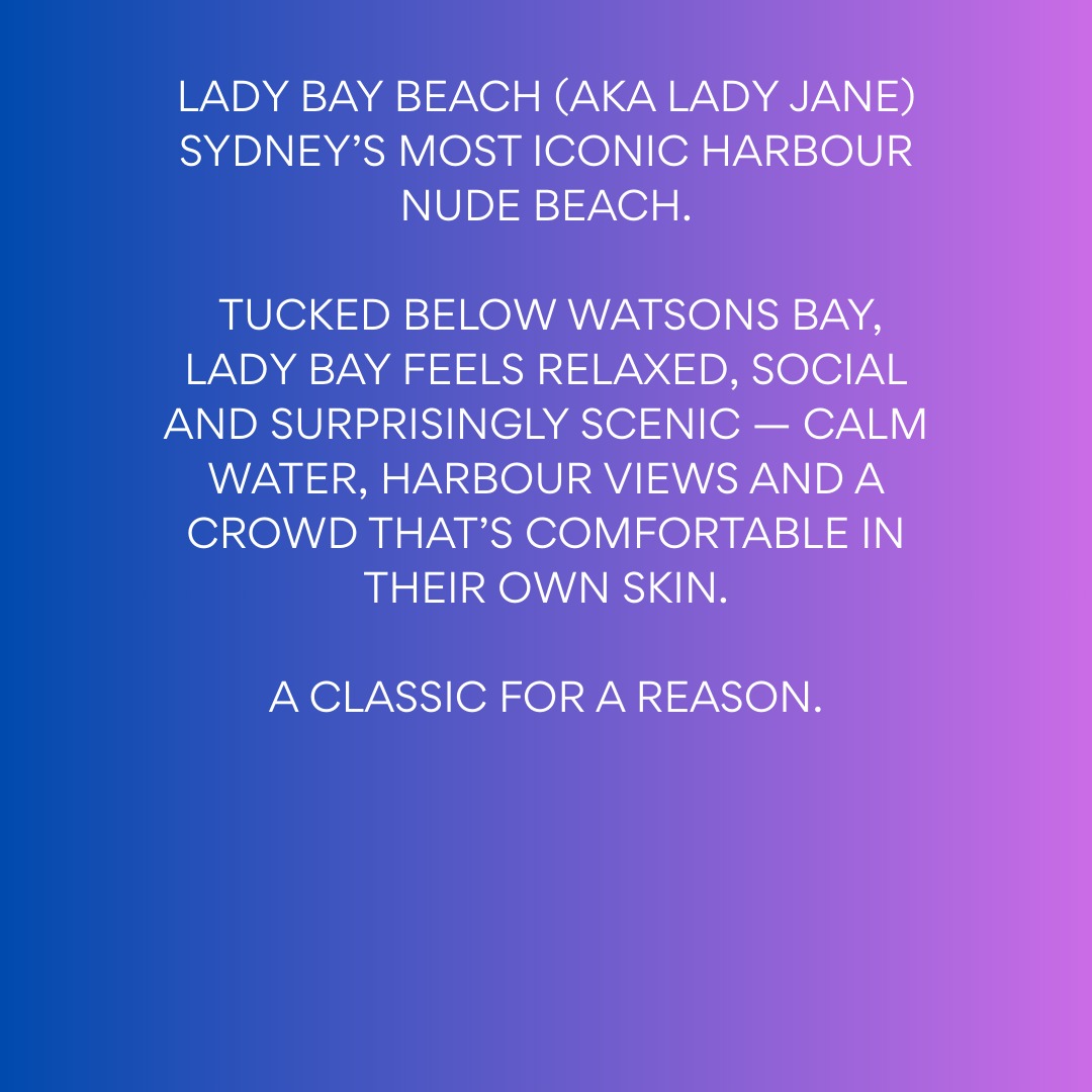 Lady Bay, also known as Lady Jane, is Sydney's most famous nude beach and the one most people mean when they talk about the city's clothing-optional scene. Tucked below Watsons Bay on the harbour's South Head, it sits at the end of a short walking track through bushland that gives the arrival a satisfying sense of discovery even if you've been dozens of times.